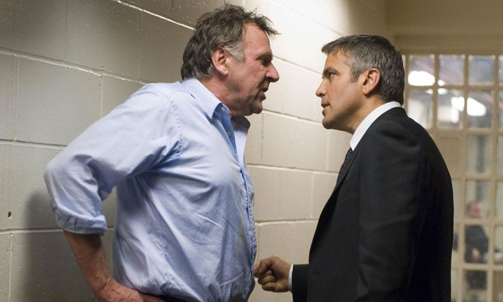 Michael (George Clooney), a “fixer” for a big corporate law firm, is called in to clean up the mess after one of the firm’s senior litigators, Arthur Edens (Tom Wilkinson), gets naked and has a complete meltdown during a deposition. A manic-depressive who is off his meds and having an episode, Arthur is also a man whose conscience has clearly caught up with him and he just can’t take defending a pesticide company any longer. “I am Shiva, the god of death,” he declares before Michael springs him from jail.