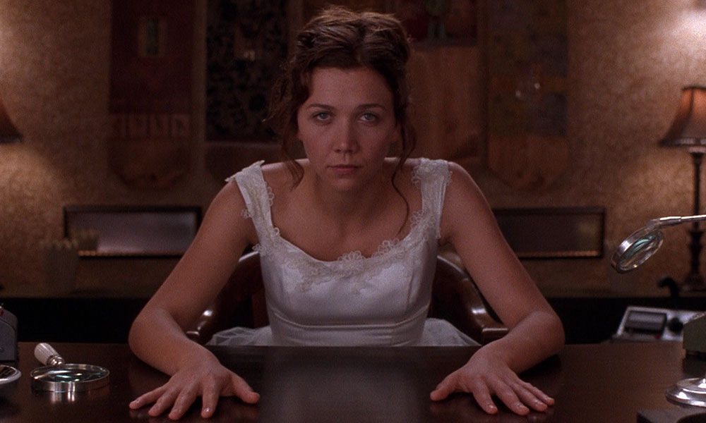 After Lee (Maggie Gyllenhaal) realizes she cannot marry the sincere-but-dull Peter (Jeremy Davies) and runs back to masochist attorney Mr. Grey (James Spader), still in her would-be wedding dress, he commands her to sit with her palms on the desk and her feet on the floor until his (delayed) return. A parade of well-meaning visitors comes to see her with gifts of food, feminist literature and advice (“There are other ways to show your feelings, Lee—more conventional ways.”) Through it all, Lee maintains control, until the very end, when her father sits across from her and declares, “Your soul and your body are your own and yours to do with as you wish.” She tears up and says in a little-girl voice, “Thank you, Daddy.”