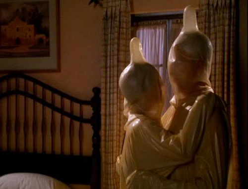 Latex runner-up: THE NAKED GUN: FROM THE FILES OF POLICE SQUAD (1988), when Priscilla Presley says, all breathy and bedroom-voiced, I want you to know, I practice safe sex, and Leslie Nielsen responds, all studly-voiced and meaningful eye contact, So do I. White sheer curtains blow in a gentle breeze in the softly lit room... cut to the couple, each clad in a full body condom.